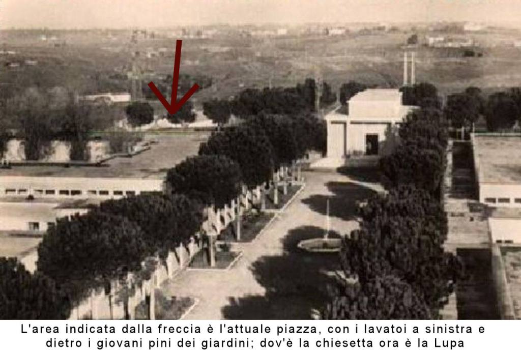 Poco tempo prima era stata abbattuta la vecchia chiesetta (un momento di grande divertimento per i ragazzi del Villaggio fu quando gli operai consentirono ai ragazzi stessi di distruggere le vetrate a sassate – oggi sarebbe inimmaginabile!), e al suo posto fu inaugurato il più importante dei monumenti legati alla storia degli esuli. Infatti, il 28 maggio (a 25 anni dalla firma del Trattato di Pace di Parigi con il quale i giuliano-dalmati avevano perso le loro terre), su quell’area venne posta, con una solenne cerimonia, la Lupa romana con i gemelli, portata via da Pola dagli esuli nel 1947 assieme al suo basamento (e poi lasciata nei magazzini dell’Arsenale Militare di Venezia per 25 anni). La Lupa fu anche benedetta dal card. Dell’Acqua.