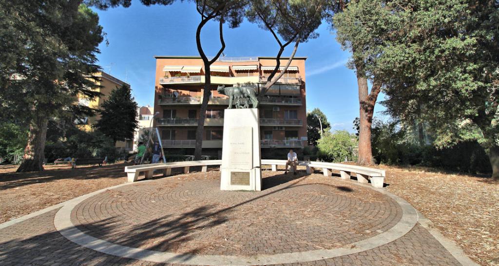 Tutta la parte in fondo della Piazza, inclusa quindi la Lupa e l’emiciclo attorno, sono parte del giardino Zeriav. Il giardino è sempre stato presente, ma è stato intitolato al maestro Zeriav solo nel 2007 con una cerimonia presieduta dal sindaco Veltroni.