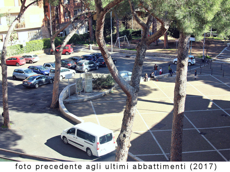 La piazza è (ormai solo parzialmente) ombreggiata dagli storici pini marittimi piantati all’epoca del Villaggio Operaio dell’E42 nel 1938.