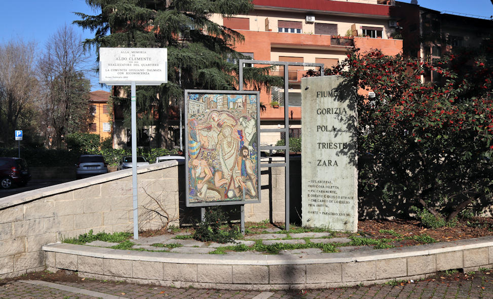 Il momento chiave della Piazza fu il 27 maggio 1962, quando fu le fu ufficialmente dato il nome Piazza Giuliani e Dalmati, e fu inaugurato in piazza il cosiddetto “Monumento all’Esilio”, realizzato dal grande maestro polesano (e figura chiave del mondo degli esuli al Villaggio Giuliano) Amedeo Colella. Si tratta di un bellissimo mosaico raffigurante le città perdute giuliano-dalmate accanto ad una colonna in travertino con i nomi delle suddette città e le parole che Dante recita sull’esilio nel Canto XVII del Paradiso.