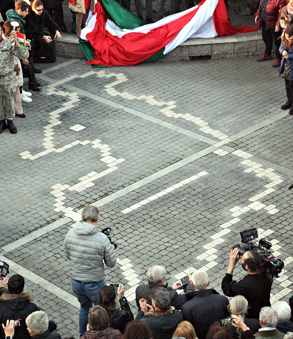 Si tratta di una serie di “mattonelle” poste sulla parte pedonalizzata davanti alla chiesa di San Marco, riproducenti con la loro disposizione la forma delle “terre perdute” della Venezia Giulia e riportanti i nomi e le città d’origine delle famiglie esuli venute a vivere al Villaggio Giuliano.