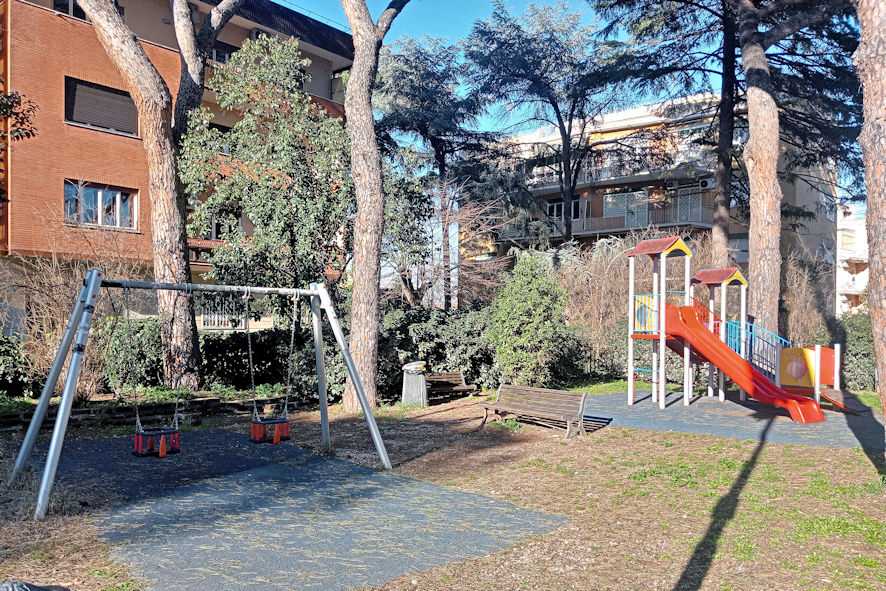 Nella primavera 1994 venivano collocati nei giardini di Piazza Giuliani e Dalmati i primi “giochi bambini” che includevano uno scivolo, un’altalena e due dondolini.