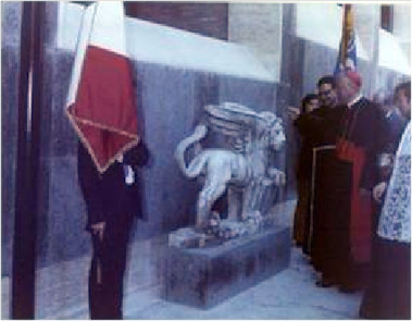 Il 25 aprile 2017, festa di San Marco, per volere di don Giulio e con la partecipazione del Comitato di Roma ANVGD, veniva finalmente collocato il Leone di San Marco sulla facciata della chiesa. Il leone, dono della famiglia Foscari di Venezia (vedi avanti i dettagli), era rimasto per oltre 40 anni nel sottoscala a causa del veto imposto dall’arch. Canino.