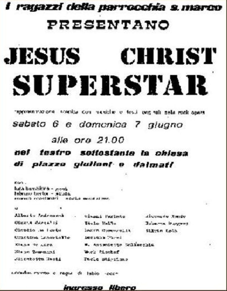 Nel giugno 1978 si ebbe la prima di uno spettacolo al Teatro della Parrocchia, all’epoca senza nome (nella locandina compare come “teatro sottostante la chiesa”), ma più tardi battezzato “Teatro Sammarco”: si trattava del musical Jesus Christ Superstar preparato dai ragazzi della Parrocchia con la regia di Fabio Rocchi (nipote di padre Flaminio).