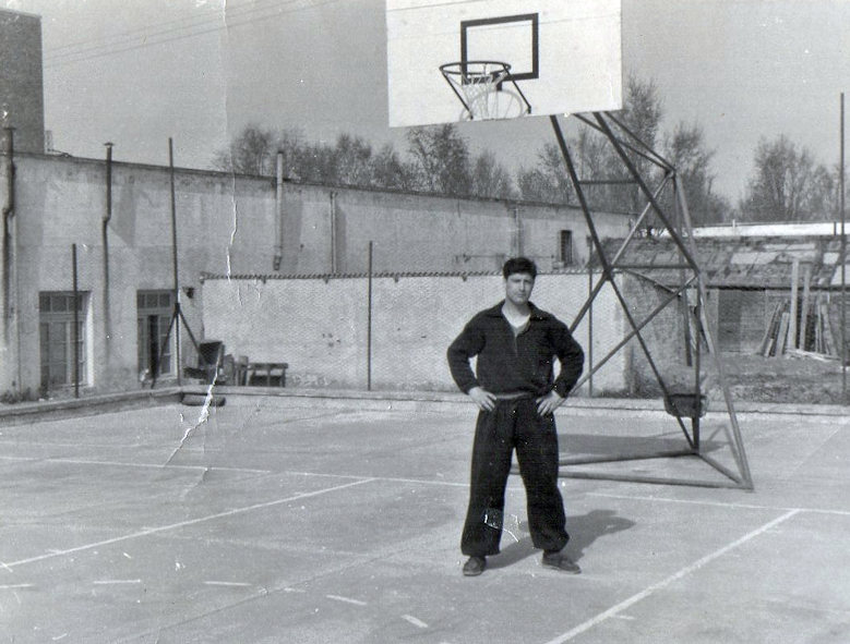 Questo era il campetto della Giuliana prima della risistemazione (nella foto a sinistra, una partita “in casa” della squadra di basket; in quella a destra, Giorgio Schürzel, esule rovignese, in posa sotto il canestro):