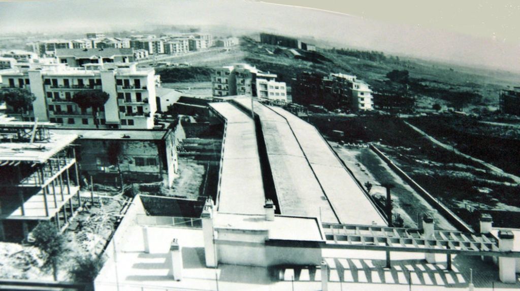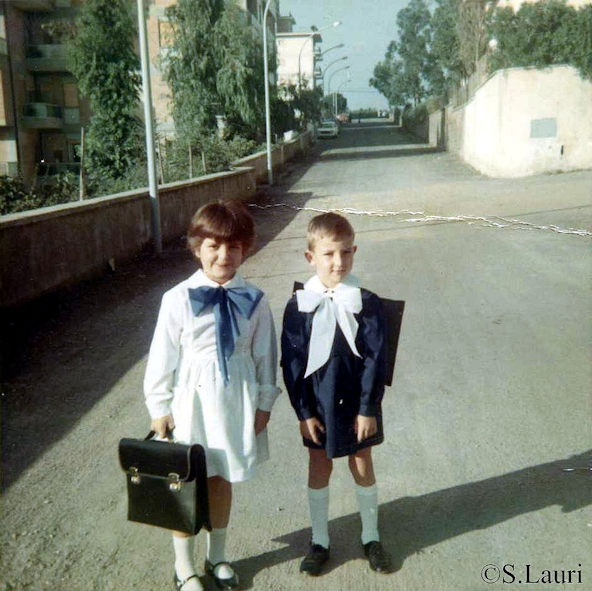 Le palazzine sul lato opposto (che in gran parte hanno l’ingresso su Via degli Artificieri) sono successive, a partire dalla metà degli Anni ’60. Nella foto Simonetta Lauri e Gabriele Firmi il primo giorno di scuola (1966)