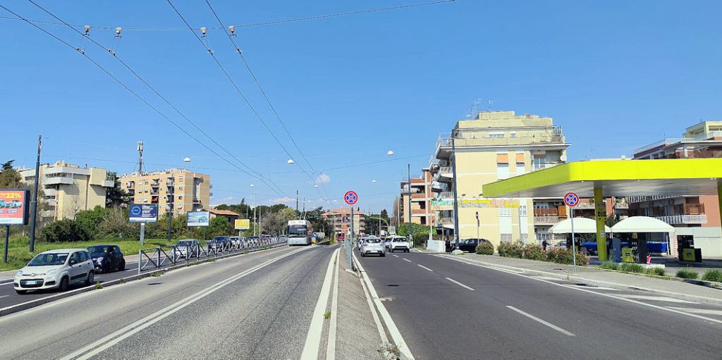 Nel primo tratto fino all’incrocio con Viale Sinigaglia sulla destra e Viale dell’Umanesimo sulla sinistra la strada è molto larga in quanto ospita al centro le corsie preferenziali per il filobus.