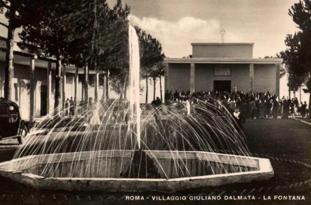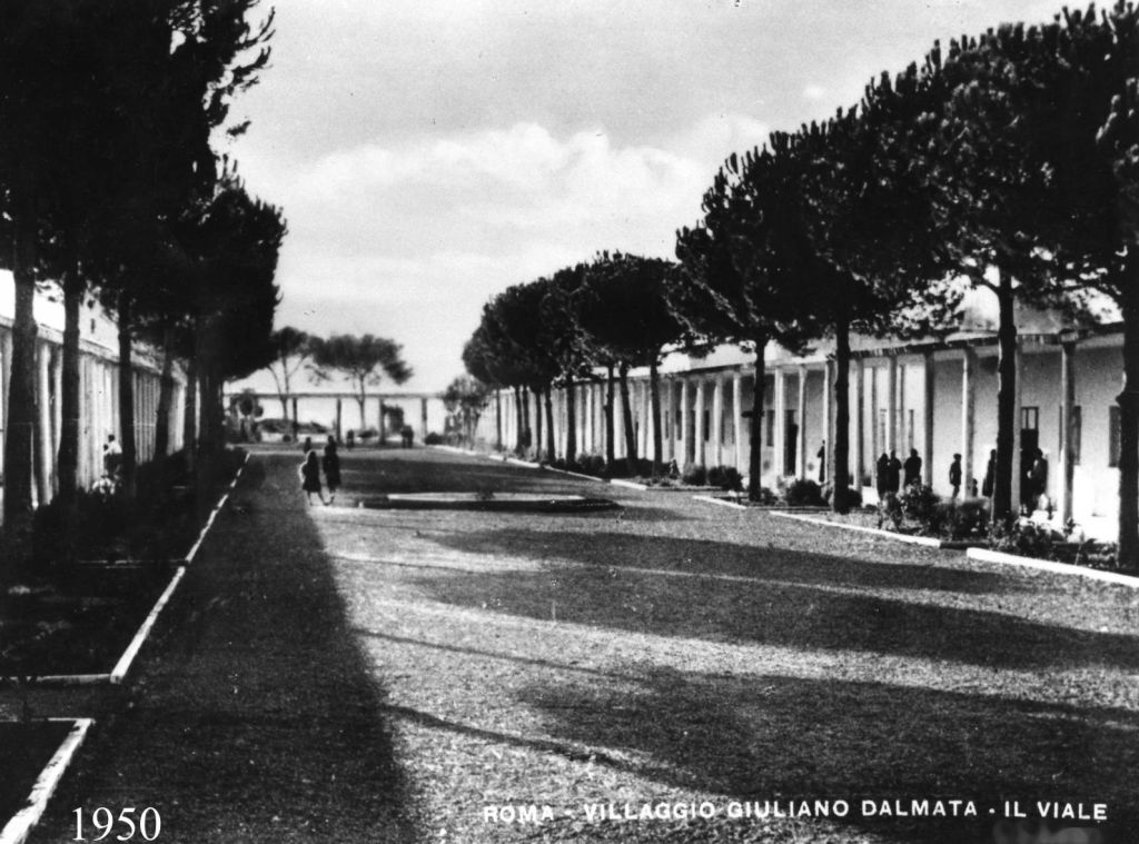 Ai lati, i padiglioni dove vivevano tutti i profughi, fino alla costruzione delle prime case su Via Cippico nel 1953, resesi necessarie quando il numero degli esuli sopraggiunti era diventato troppo grande. Al centro si intravede la fontana (si vede meglio in una foto più avanti).
